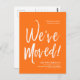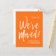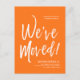 A minimal solid Pumpkin Orange and white script-style moving announcement postcard. It features a large script text of the words "We've Moved" followed by your address information below it. Many individual elements of the invite card are unlocked so feel free to change or add any details necessary by using the customisation function.