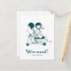 Both side print New Address Postcard, featuring an original drawing image of a lovely couple riding together on a motorcycle, he is the driver and she is sitting behind him, holding him around his waist. Instead of gas coming out of the motorcycle, there are little red love hearts, the same colour as the cheeks of both vespa riders. Below is customisable text saying: "We've moved! Visit us soon"