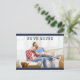 Personalised moving announcement card. The photo template is set up for you to add your own photo to the front and you can also customise all of the wording. The design features typewriter text typography overlay on the front which reads "WE'VE MOVED" (editable) with dark blue borders. The back of the postcard has your custom moving announcement message including your new address and you can also put your return address in the top corner if you wish. Simple and modern card to let your friends and family know your change of address.