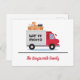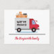 A cute red truck with moving equipment on front of a postcard as anouncement for your new home.