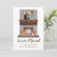 Announce your move and new address to friends and family with our unique Rustic Fall Farmhouse Fireplace moving announcement! The fall moving announcement features your square family photo in a dark wooden frame mounted on a brown brick fireplace. The fireplace mantle is decorated with a garland of watercolor autumn leaves with orange buffalo check pillows, white candles, and orange and white pumpkins located on the hearth. Personalise the family photo moving announcement with your name, address, and other text. The back provides additional space for text and images. The moving announcement card is perfect for fall and Thanksgiving.