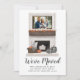 Announce your move and new address to friends and family with our unique Rustic Fall Farmhouse Fireplace moving announcement! The fall moving announcement features your horizontal family photo in a dark wooden frame mounted on an off-white brick fireplace. The fireplace mantle is decorated with a garland of watercolor autumn leaves and white pumpkins with white candles, black and white buffalo plaid pumpkins, and other fall decor located on the hearth. Personalise the family photo moving announcement with your name, address, and other text. The back provides additional space for text and images. The moving announcement card is perfect for fall and Thanksgiving.