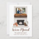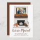 Announce your move and new address to friends and family with our unique Rustic Fall Farmhouse Fireplace moving announcement! The fall moving announcement features your horizontal family photo in a dark wooden frame mounted on an off-white brick fireplace. The fireplace mantle is decorated with a garland of watercolor autumn leaves with white candles, white and orange pumpkins, and other fall decor located on the hearth. Personalise the family photo moving announcement with your name, address, and other text. The back provides additional space for text and images. The moving announcement card is perfect for fall and Thanksgiving.