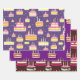 Three sheets of birthday paper wrap with whacky birthday cake designs, each sheet a different pattern, make a great gift-wrapping option for a birthday present. The three different patterns make the birthday present look more festive and fun, and the birthday cake designs add a touch of playfulness to the gift.