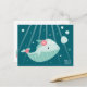 "Whale Maui" Postcard with a illustration of a whale wearing a beautiful hibiscus flower and a starfish surrounded by bubbles. Just a day in the ocean of Maui, Hawaii.
