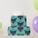 Gift wrap with a badge style graphic pattern features whale tail silhouette with mountain outline on light aqua background