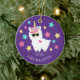 Personalise & Dated Cute llama unicorn Christmas Ornament featuring a adorable unicorn llama wearing sunglasses & framed with purple, pink & yellow star is set on a dark purple background.