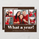 This simple and funny multi photo holiday card says "What a year!" in white, modern typography on a rustic, brown wood look background with a five photo grid on the front of the card. The back contains two more photos, plus a spot to add your own personal message. A cute and stylish way to celebrate making it to the end of a very difficult year! Perfect for either Christmas or New Year's.