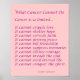 Text of 'What Cancer Cannot Do" Poem What Cancer Cannot Do Cancer is so limited... It cannot cripple love It cannot shatter hope It cannot corrode faith It cannot destroy peace It cannot kill friendship(s) It cannot suppress memories It cannot silence courage It cannot invade the soul It cannot steal eternal life It cannot conquer the spirit. -Author Unknown This poster print makes an inspirational cancer gift!