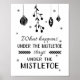This humourous Christmas poster will be the perfect addition to your home decor during the holiday season. This design features the phrase "What happens under the mistletoe stays under the mistletoe" in a combination of black fonts, with a sprig of mistletoe and some Christmas ornaments and snow.