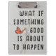 Office clipboard with encouraging quote What if Something Good is About to Happen and a monarch butterfly. Encourage yourself or a friend. Turn negative thoughts into positive possibilities.