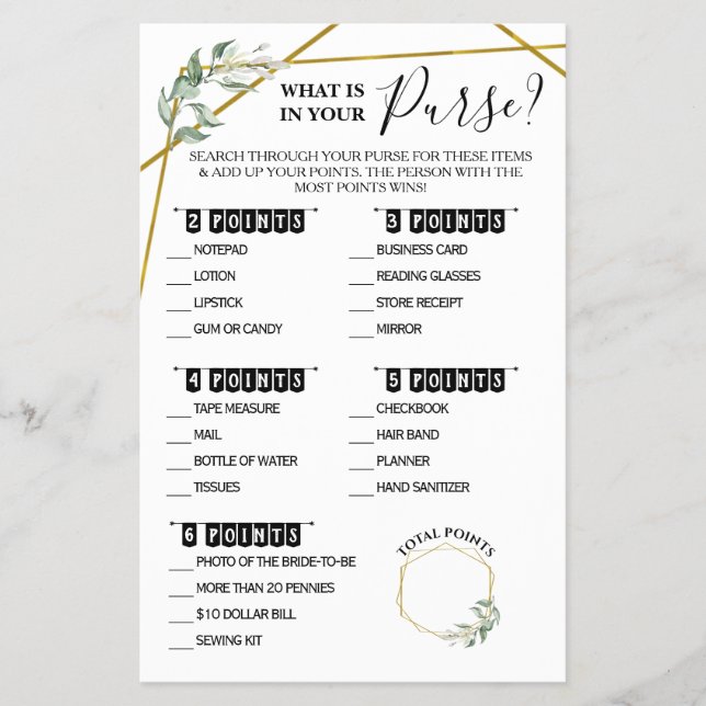 What is in your Purse Greenery Shower game card