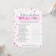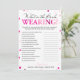This modern What is the bride wearing game features a pink magenta background with metallic confetti. The text is written in a mix of a playful calligraphy font and a modern serif font, this card is personalised with the Bride-to-be name and the Bridal Shower date.