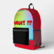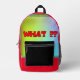 Lightweight and durable, our custom all-over-print Backpack is just what you need. The spacious interior is ideal for travel, school, gym, or any mobile storage need. Bring your stuff with you in style! Features Adjustable padded shoulder straps, two chambers on the inside for laptop storage, mesh side pockets and an identification label.