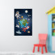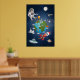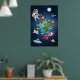 What’s happening around planet earth, a view from space. Poster image with rocket, astronaut, satellite, moon, etc…