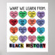 The image contains a colourful and educational poster titled "WHAT WE LEARN FROM BLACK HISTORY." The poster features 16 heart-shaped icons, each with a different message, and a colourful "BLACK HISTORY" text at the bottom. Each heart contains an inspirational action or quality followed by the name of a noteable figure in Black history.