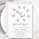 This cute Gender Reveal Invitation is decorated with watercolor, pink and blue butterflies, and stylish script typography.
