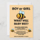 Beautifully designed 'What Will Baby Bee?' gender reveal party invitation. This invitation sets the tone for a memorable gender reveal where loved ones and friends gather to unveil the exciting news of your baby's gender. Feel free to customize/personalize this invitation to your liking. Enjoy your gender reveal!