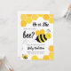 A honey bee themed gender reveal party invitation. Features hexagonal honey-comb border and whimsical bee design with the phrase "He or She, what will baby bee?"