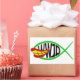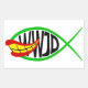 A parody design of the Ichthys (Jesus Fish). The design of the Ichthys fish, mashed up with the Joker Fish from a comic book cartoon. WWJD in black text is inside the fishing, asking, "What Would Joker Do?"