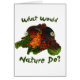 A lovely, colourful watercolor style image of a rustic country garden cornucopia, with red strawberries, blueberries, chard, purple grapes, bright orange carrots, and more, framed by the words, What Would Nature Do? Perfect for farmer's markets, organics, shopping, or any rustic setting.
