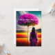 Colourful flat greeting card features surreal dreamscape background of woman looking over vast mountain lined meadow with large centre purple flower. Rumi seek quote in modern script font overlays the sky. Image created using AI software.