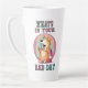 "What's In Your Bad Day" latte mug design, features a charming and whimsical dog having a bad day self soothing with a drinking fit. This adorable and colorful design is here to brighten your day, no matter what life throws your way. Embrace the playful humor of our design and let this cute pup bring a smile to your face.