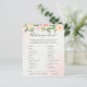This baby shower game card features beautiful soft pastel watercolor roses and peonies in shades of blush pink and peach with lush green botanical leaves and eucalyptus.