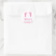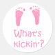 What's Kickin'? baby footprint stickers, with cute little baby feet in pink. Also available in green or blue.
