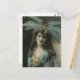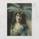 Vintage painted photograph of a young woman with long hair and an odd winged like hat on