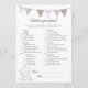 A fun game for the gender reveal party is the What's on your phone? game. This game features a silver grey and brown banner at top and a baby elephant at bottom. On the reverse is an elephant that's smiling with its trunk raised upward with templates.