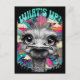 An ostrich with exaggerated features is depicted against a vibrant and colourful background, with the phrase "WHAT'S UP?" in bold letters above its head. The artwork combines elements of whimsy and pop art styles, creating an eye-catching display.