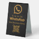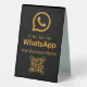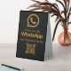 Enhance your business outreach with this sleek and modern table tent sign. Featuring the iconic WhatsApp logo in a sophisticated gold hue against a classic black background, it boldly displays "Find Us On WhatsApp" and a space for your business name. This sign also includes a prominent QR code, allowing customers to easily connect with you instantly. Perfect for trade shows, reception desks, or any point of sale, it streamlines communication and encourages engagement. Make it effortless for clients to reach out and foster stronger connections.