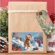 A joyful Soft Coated Wheaten Terrier runs through the snowy winter scene, wearing a festive red Christmas hat. This charming design highlights the breed’s soft flowing coat, cheerful spirit, and affectionate nature while capturing the warmth and joy of the holiday season. A delightful winter moment full of festive cheer.