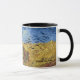 A fine art coffee mug with the post-impressionist painting, Wheatfield with Crows (1890), by Vincent van Gogh (1853-1890). The artist's name is displayed at the bottom corner of the mug. A path through the farm fields with a blue sky and a flock of crows.