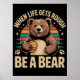 This engaging illustration features a friendly, smiling bear holding a golden honey pot. The bear is set against a vibrant, retro-inspired striped arc in warm tones, with subtle stars and paw prints flanking the bottom text. The top text "WHEN LIFE GETS ROUGH" curves above the bear, while "BE A BEAR" is boldly displayed below. The overall design conveys a sense of resilience, strength, and comfort, suggesting the ability to find sweetness and calm even in challenging times.