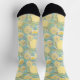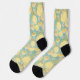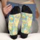 Cute socks with lots of yellow lemons on a light teal blue background.