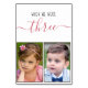 A modern, more original way to personalise your table numbers with childhood photos of bride and groom at that number age (the default is one).The placeholder photos of a little girl (the bride) and a little boy (the groom) are in black frames, in the lower half. In the upper part, there is the message "when we were three" with the age written in a pink (dusty rose) handwriting script and the rest above, in smaller black caps (hand letters).