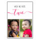 A modern, more original way to personalise your table numbers with childhood photos of bride and groom at that number age (the default is two). The placeholder photos of a little girl (the bride) and a little boy (the groom) are in black frames, in the lower half. In the upper part, there is the message "when we were two" with the age written in a fuchsia red handwriting script and the rest above, in smaller black caps (hand letters).