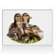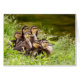 A delightful brood of mallard ducklings look out from their soft grass nook beside a quiet pond.
