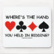 If you have ever had a bridge partner who bid wildly at the bridge table, you will enjoy this bridge humour mousepad. Featuring all four card suits (heart, club, diamond, spade), along with the query that a declarer often says to dummy, "Where's The Hand You Held In Bidding?" Make others do a double-take at the bridge table with a dose of tongue-in-cheek bridge attitude today!