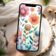 This iPhone cover features a whimsical, modern floral illustration filled with playful, stylized wildflowers. The flowers are tall and slender with exaggerated petals and circular centers, rendered in soft yet vibrant hues of teal, turquoise, coral, peach, pink, lavender, mustard, and sky blue. Each bloom has a hand-drawn, slightly textured look, giving the design an artsy, cheerful feel. Delicate stems and leaves rise vertically, creating a lively garden effect without feeling crowded. The background fades gently through light pastel tones, adding warmth and depth while keeping the overall look light and fresh. The design feels joyful, creative, and contemporary—perfect for a colorful, artistic phone case that stands out while remaining elegant and fun.