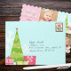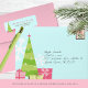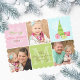 Send your seasonal greetings in style this season with this stunning and whimsical 3 photo holiday card. Featuring modern Christmas tree and gift embellishments on the front and back as well as scattered snowflakes throughout for a bright and vibe in pink, light aqua blue and greens. Available printed in a variety of paper options and corner cuts, or available for high resolution download to send your greeting cards online instead!