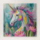 A modern abstract painting featuring a whimsical unicorn surrounded by pastel-coloured cacti and succulents. The unicorn, painted in flowing lines and vibrant colours, stands out against the soft tones of blush pinks, mint greens, and pale blues in the desert plants. This playful, imaginative composition combines the mystical aura of the unicorn with the organic beauty of desert flora, creating a dreamy, magical scene with a contemporary artistic touch.