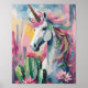 A modern abstract painting featuring a whimsical unicorn surrounded by pastel-coloured cacti and succulents. The unicorn, painted in flowing lines and vibrant colours, stands out against the soft tones of blush pinks, mint greens, and pale blues in the desert plants. This playful, imaginative composition combines the mystical aura of the unicorn with the organic beauty of desert flora, creating a dreamy, magical scene with a contemporary artistic touch.