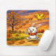 A cheerful autumn illustration featuring a happy white bunny in a plaid scarf running along a country path, with swirling fall leaves, a singing yellow bird, bright flowers, a fence, and a glowing sunset sky.