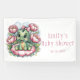A charming green dinosaur with big, expressive eyes sits atop a fluffy pink cloud, surrounded by vibrant pink flowers with detailed petals and bright yellow centres. Adorned with a cute pink bow, the dinosaur wears a gentle smile, adding to the dreamy and whimsical atmosphere. The soft blue and white cloud-filled background enhances the enchanting scene, making it a perfect design for a baby shower celebrating a little girl.