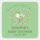 Whimsical baby shower square stickers feature a cute bee and flower wreath with customisable text on green background. Use for party favours, envelope seals and gift bags