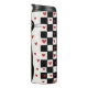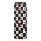 This whimsical and textured illustration features a majestic black cat wearing a golden crown and collar. The stylized cat is set against a bold black and white checkerboard pattern, with many floating red hearts filling the space.
