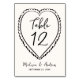 Guide guests to their seats with these whimsical wedding table number cards designed to coordinate with playful, modern wedding décor. The design features a hand-drawn black heart surrounding the table number displayed in a handwritten black script on a light cream background, with the couple’s names and wedding date shown below for a charming personal touch. The design repeats on the back for a cohesive and polished look throughout your reception. Perfect for couples who love modern, lighthearted stationery with a whimsical and romantic feel, these table number cards add personality to your reception tables. This card measures 3.5"x5". Edit each table number individually and add them to your cart to ensure a smooth ordering process.